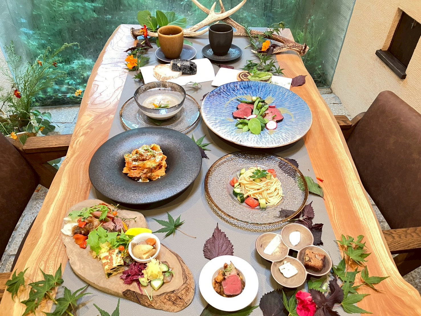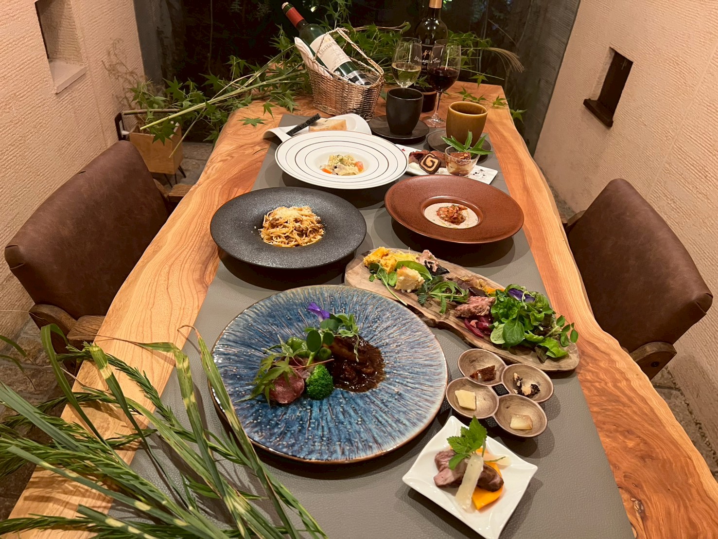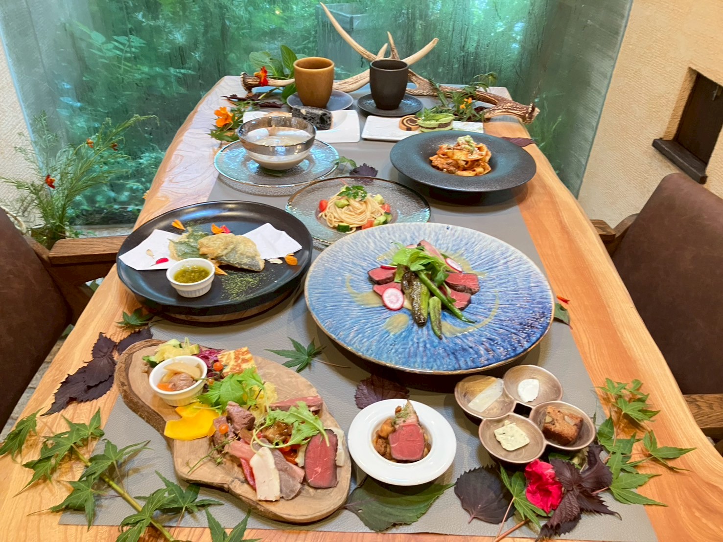 新鮮なジビエを使用し、自家栽培や契約農家からの季節のこだわり食材をふんだんに使用したディナーコース。