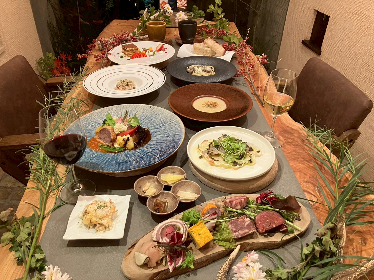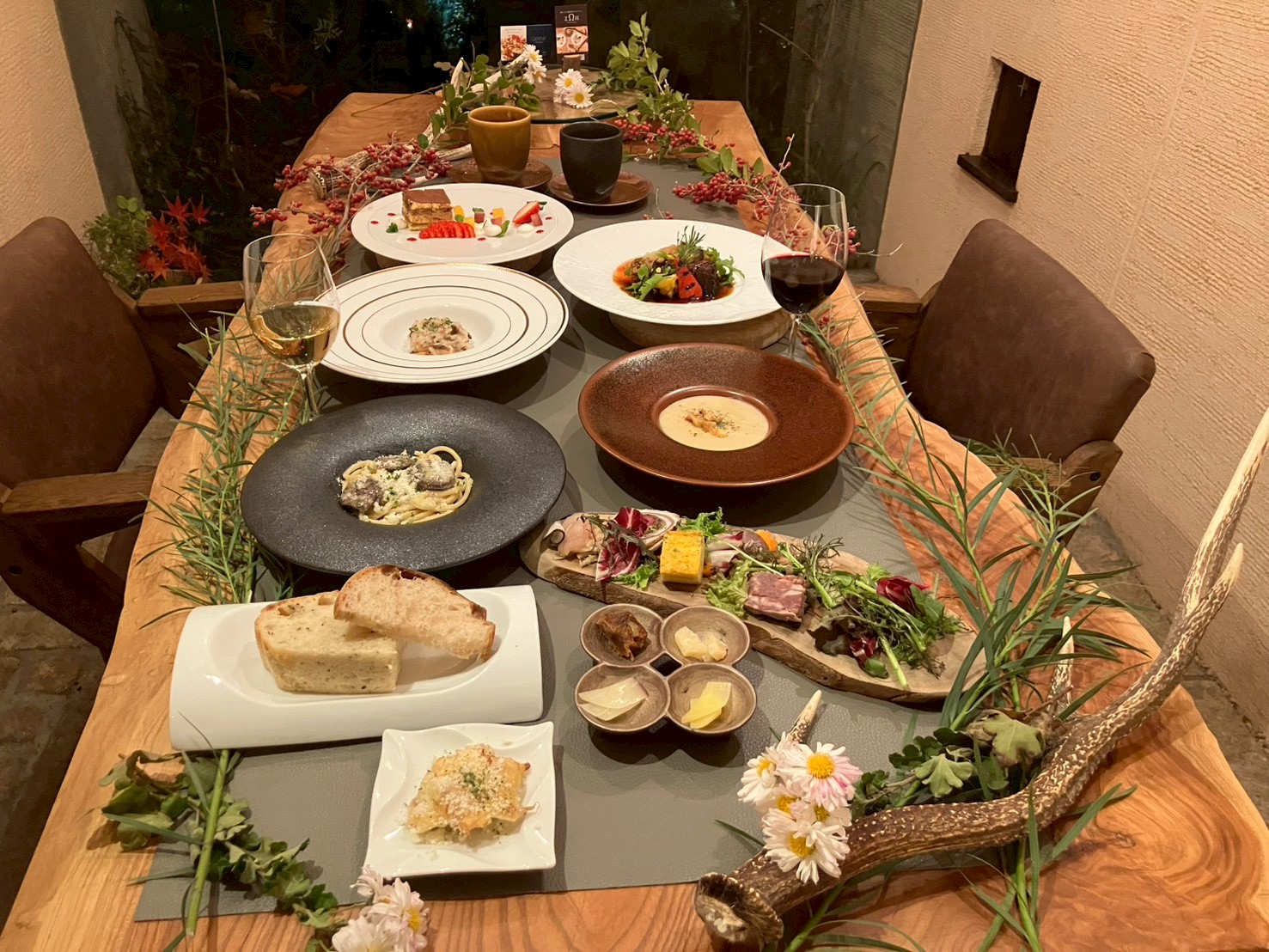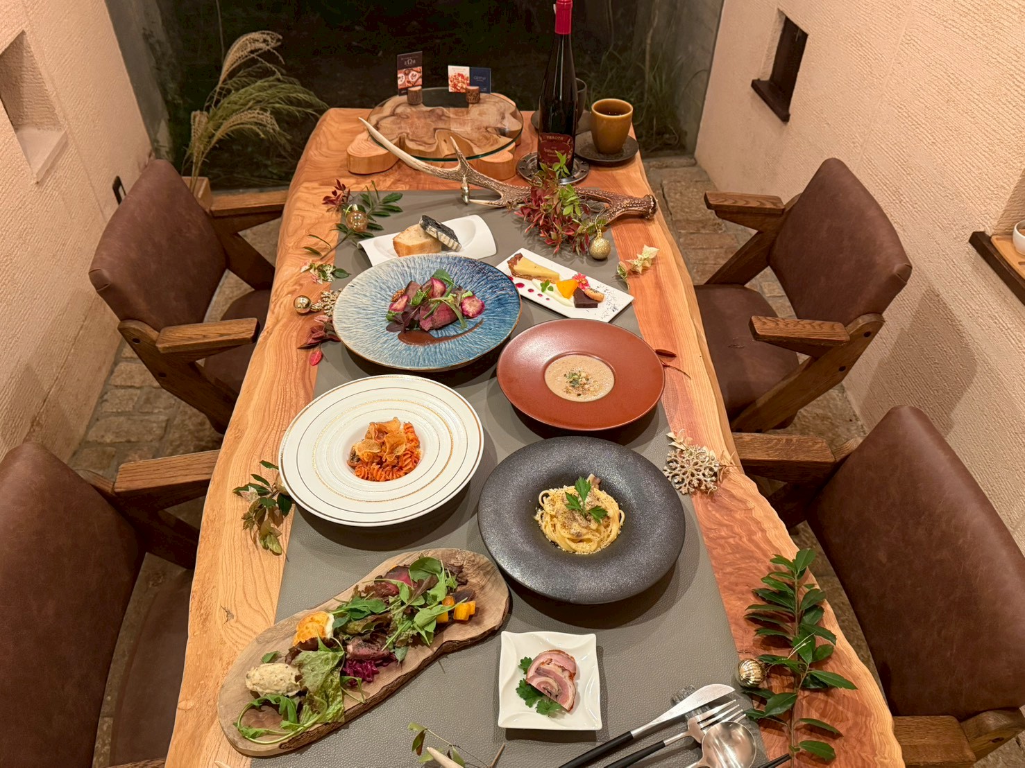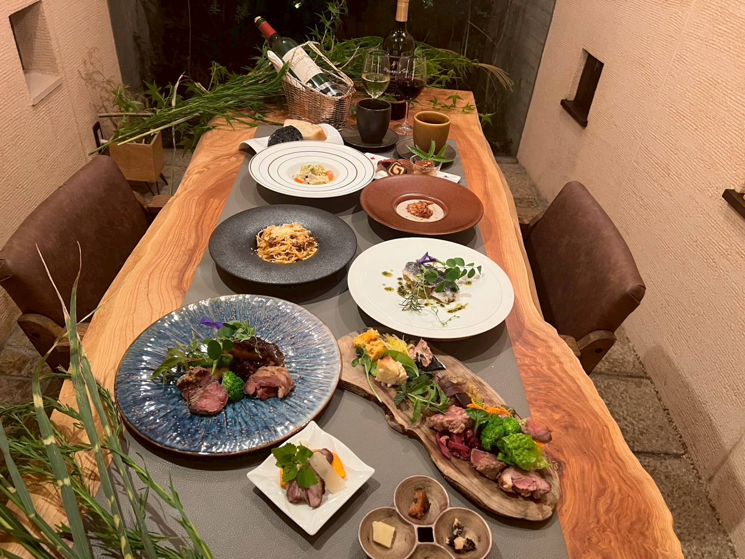 新鮮なジビエを使用し、自家栽培や契約農家からの季節のこだわり食材をふんだんに使用したディナーコース。