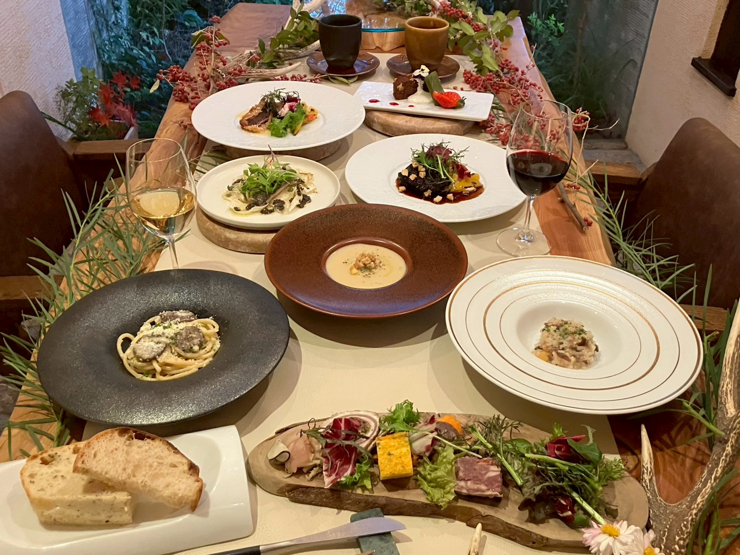 季節の野菜から自社いけすで育てた足助産の鱒料理、メイン料理は、焼き加減が選べる新鮮な鹿のローストなど、当店自慢の創作料理をたくさん詰め込みました。ボリューム満点のコースです。